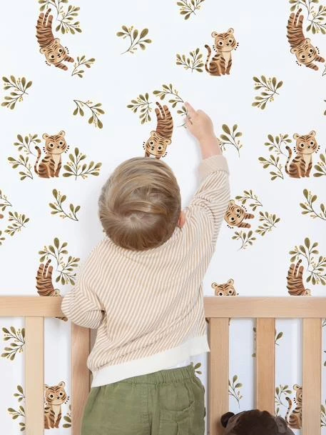 Retrouvez l’univers Felidae de Lilipinso avec ce papier peint aux couleurs chaudes et motifs vintages : les tigres sautent au milieu de la faune et la flore de la jungle. Â